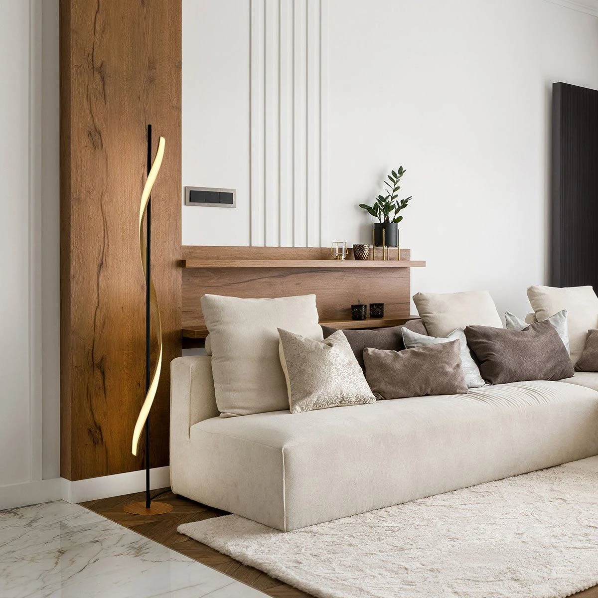 On craque complètement pour ce lampadaire design de la collection MATWOOD. Conçu sur une structure en métal noir mat, il possède une source lumineuse tout en ondulation, elle aussi fabriquée en métal dans une belle couleur effet bois pour apporter un charme authentique. Moderne, charismatique et tendance, ce lampadaire trouvera sa place dans un coin de votre salon pour apporter une touche contemporaine et chaleureuse ou bien proche de votre table à manger pour illuminer vos moments de partage en famille ou entre amis. Luminaire équipé de la technologie LED intégrée pour vous faire profiter au quotidien d’un superbe éclairage en même temps chaleureux et fonctionnel (1700 lumens – 3000 kelvins couleur blanc chaud), tout en restant faible en consommation d’énergie (26W) et durable dans le temps. Dimensions : hauteur 150cm x diamètre 20.5cm. Existe également dans la même collection MATWOOD en version suspension barre, lampe à poser ou encore applique murale.