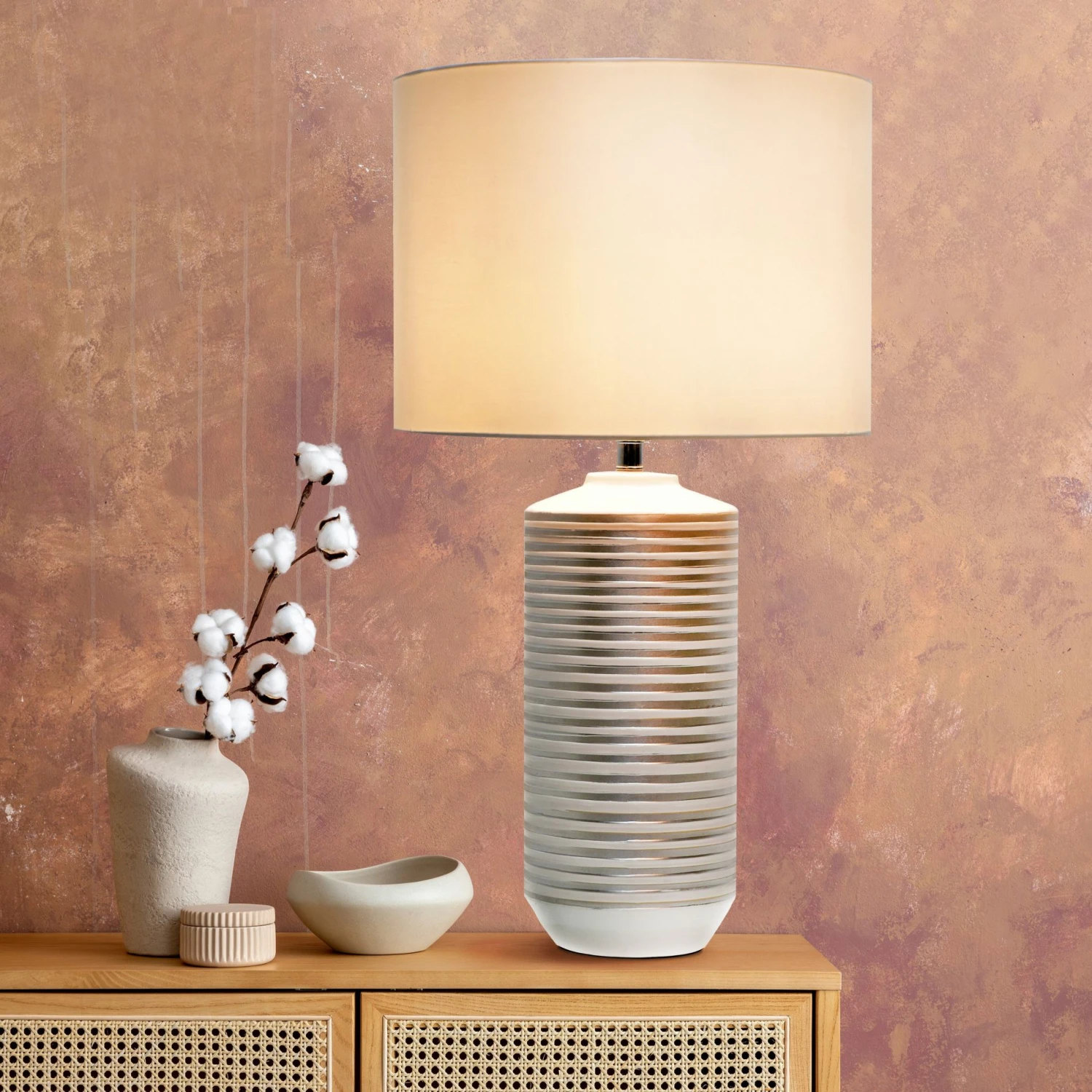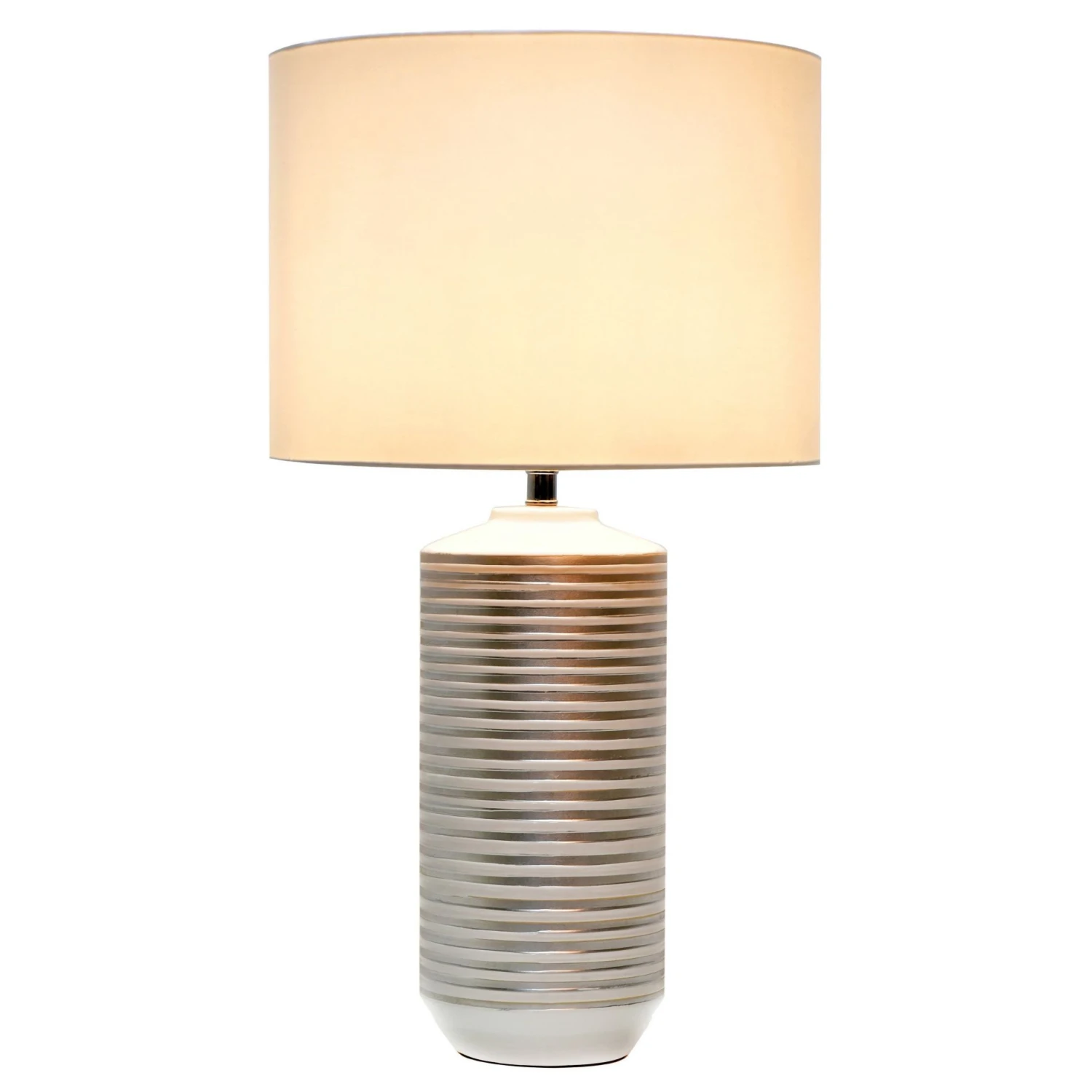 Illuminez sans plus attendre votre quotidien avec cette superbe lampe de la collection STRAYE. Son pied conçu en céramique avec de superbes rayures incrustées blanches et argentées se marie parfaitement avec son abat-jour fabriqué en tissu blanc. On adore ce mélange des matières qui apportera à votre décoration intérieure un charme moderne et une ambiance hyper chaleureuse. Cette lampe à poser est idéale sur un guéridon dans un salon ou une salle à manger en éclairage d’accompagnement par exemple, ou bien sur une commode dans une entrée ou un couloir pour une lumière plus fonctionnelle et accueillante. La lampe STRAYE sera tout aussi parfaite dans une chambre à coucher en guise de lampe de chevet pour instaurer une atmosphère douce et cocooning. Luminaire équipé d’une douille E27 compatible avec une ampoule d’une puissance maximale de 40W (ampoule non incluse). Dimensions : hauteur totale 80cm x hauteur du pied 46cm x diamètre du pied 21cm x hauteur abat-jour 32cm x diamètre abat-jour 45cm x longueur câble 150cm. Interrupteur sur câble d’alimentation. Existe également dans la même collection STRAYE en version hauteur 50cm ou bien en coloris blanc/doré.