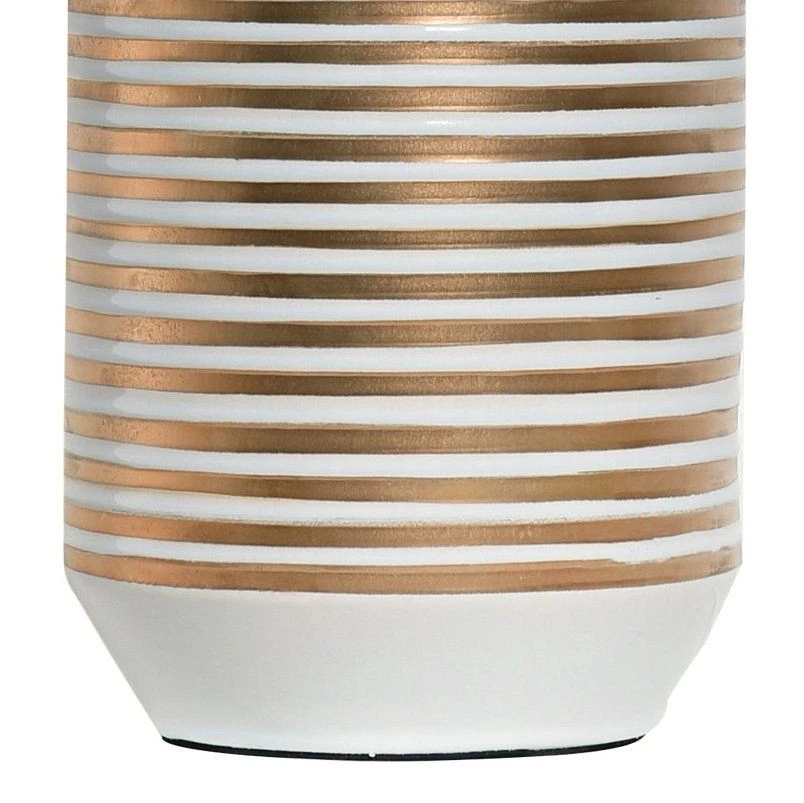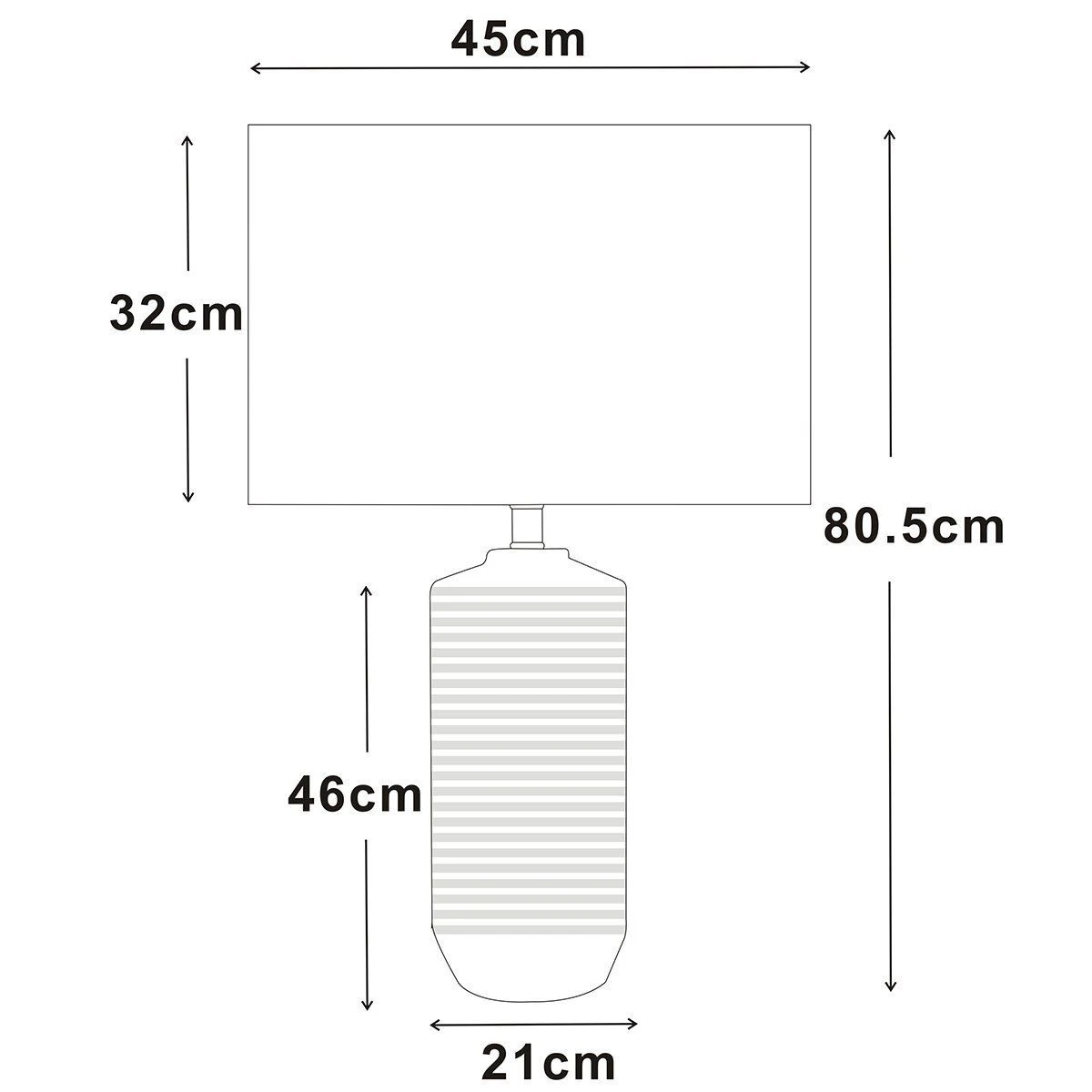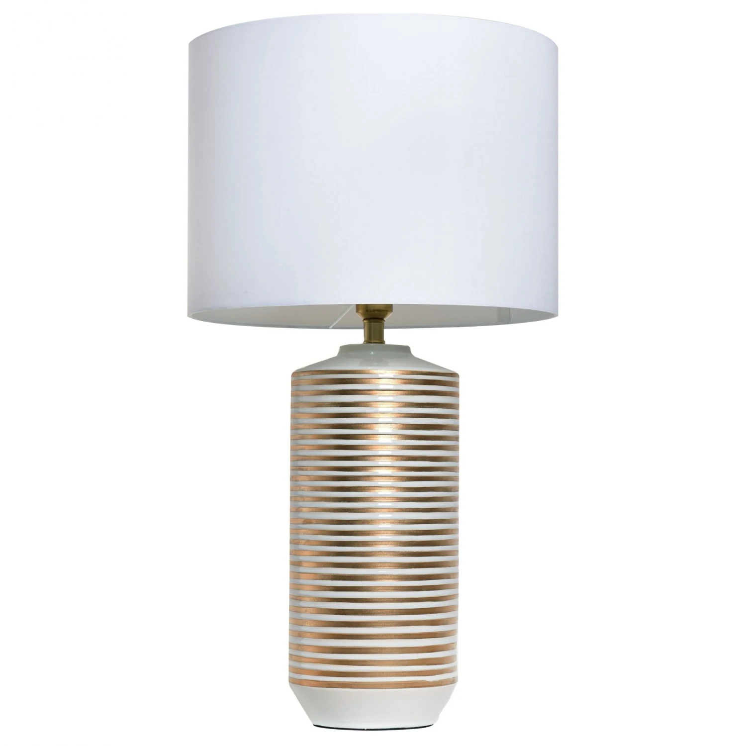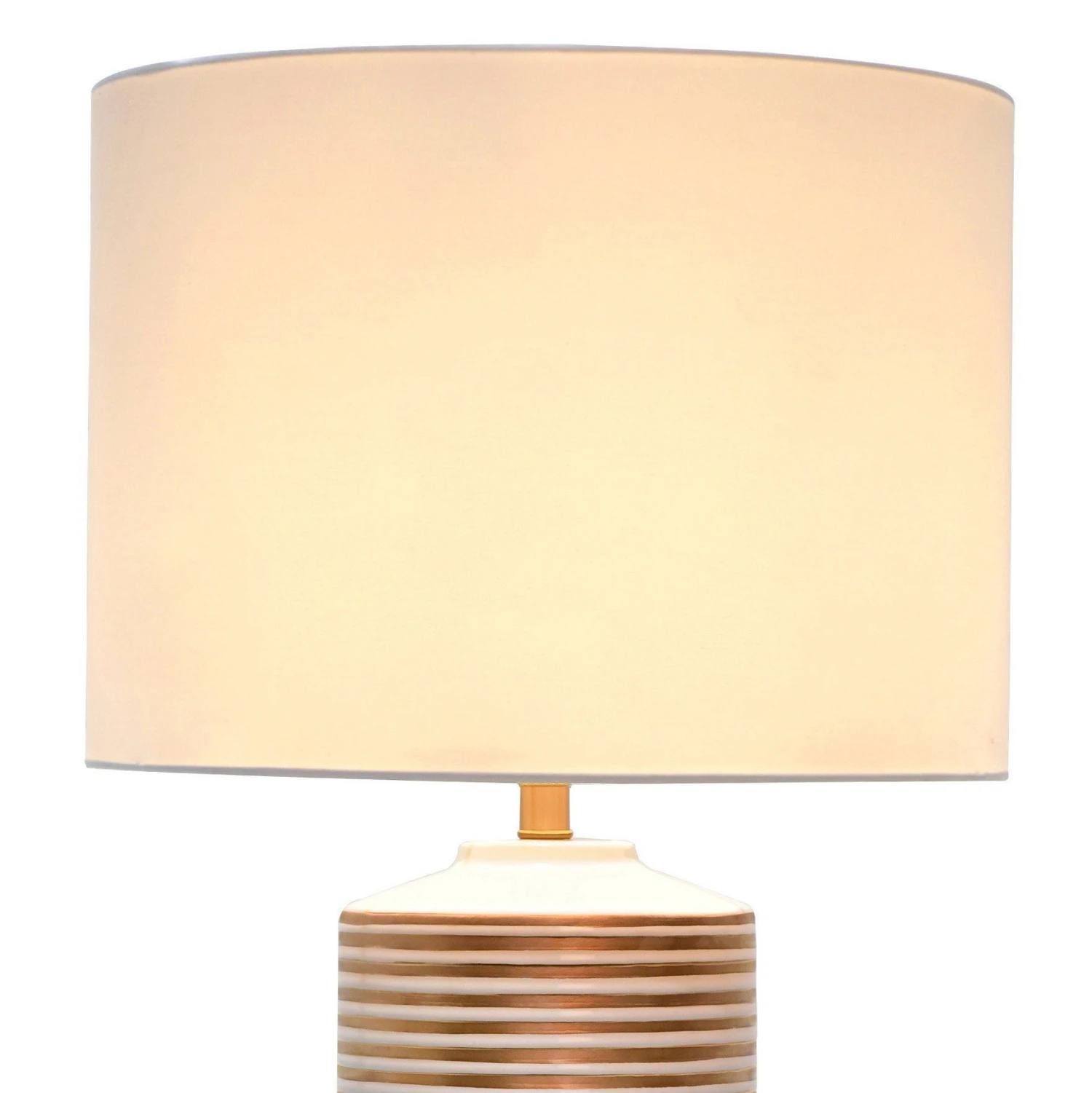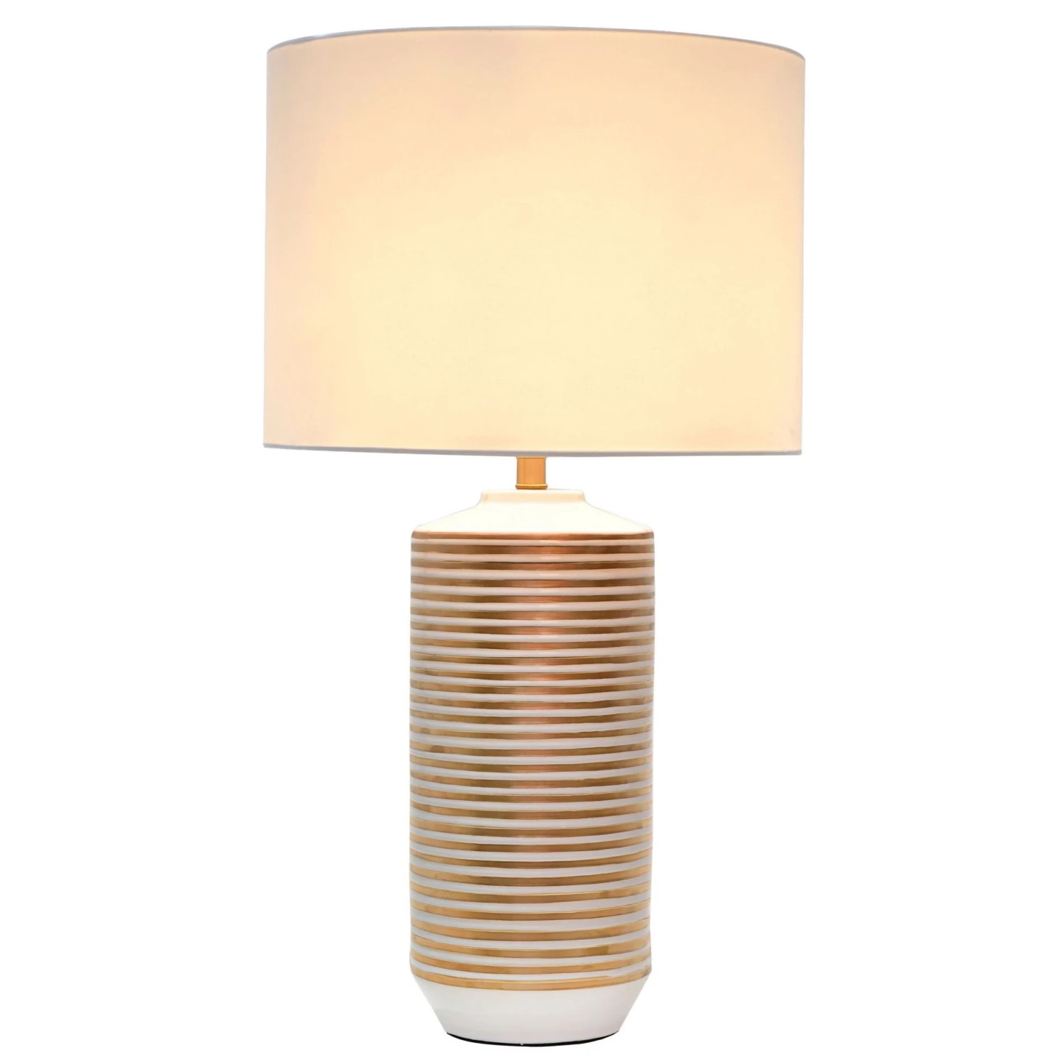 Illuminez sans plus attendre votre quotidien avec cette superbe lampe de la collection STRAYE. Son pied conçu en céramique avec de superbes rayures incrustées blanches et dorées se marie parfaitement avec son abat-jour fabriqué en tissu blanc. On adore ce mélange des matières qui apportera à votre décoration intérieure un charme moderne et une ambiance hyper chaleureuse. Cette lampe à poser est idéale sur un guéridon dans un salon ou une salle à manger en éclairage d’accompagnement par exemple, ou bien sur une commode dans une entrée ou un couloir pour une lumière plus fonctionnelle et accueillante. La lampe STRAYE sera tout aussi parfaite dans une chambre à coucher en guise de lampe de chevet pour instaurer une atmosphère douce et cocooning. Luminaire équipé d’une douille E27 compatible avec une ampoule d’une puissance maximale de 40W (ampoule non incluse). Dimensions : hauteur totale 80cm x hauteur du pied 46cm x diamètre du pied 21cm x hauteur abat-jour 32cm x diamètre abat-jour 45cm x longueur câble 150cm. Interrupteur sur câble d’alimentation. Existe également dans la même collection STRAYE en version hauteur 50cm ou bien en coloris blanc/argent.