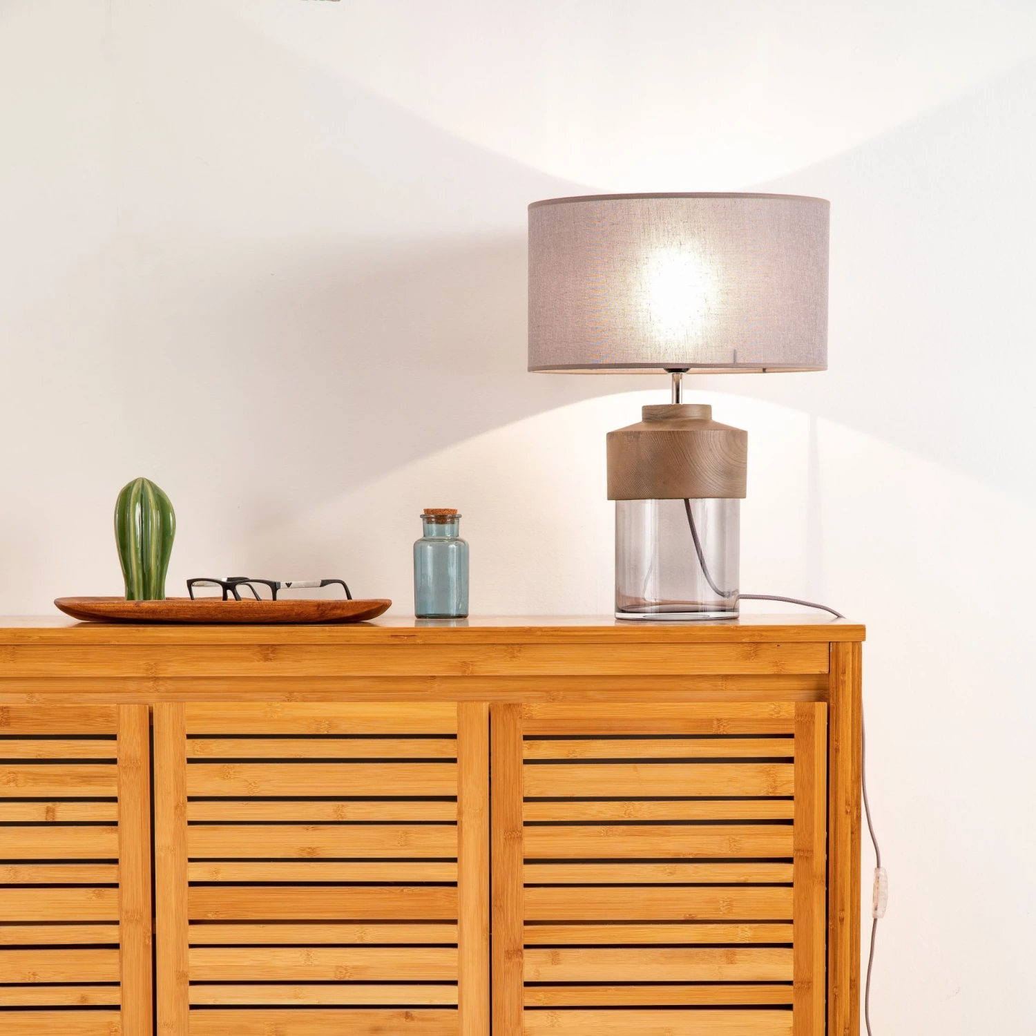 Illuminez sans plus attendre votre quotidien avec cette superbe lampe de la gamme FYUME. Son pied conçu en verre transparent fumé avec un beau détail en bois naturel foncé se marie parfaitement avec son abat-jour fabriqué en tissu gris. On adore ce mélange des matières qui apportera à votre décoration intérieure un charme moderne et une ambiance hyper chaleureuse. Cette lampe à poser est idéale sur un guéridon dans un salon ou une salle à manger en éclairage d’accompagnement, ou bien sur une commode dans une entrée par exemple. La lampe FYUME sera tout aussi parfaite dans une chambre à coucher en guise de lampe de chevet pour instaurer une atmosphère douce et cocooning. Luminaire équipé d’une douille E27 compatible avec une ampoule d’une puissance maximale de 60W (ampoule non incluse). Dimensions : hauteur 53cm x diamètre 35cm x longueur câble 200cm. Existe également dans la même collection FYUME en version diamètre 38cm.